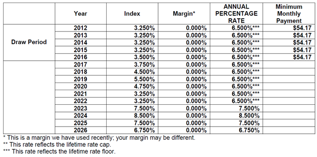 12. Maximum Rate and Payment Example: If you had an outstanding balance of $10,000 during the draw period, the minimum monthly payment during the draw period at the maximum ANNUAL PERCENTAGE RATE of 16.000% (this maximum rate is 9.25 percentage points above the most recent index plus margin shown in the Historical Example below) would be $133.33. This annual percentage rate could be reached on the first day following the date your line of credit is opened.